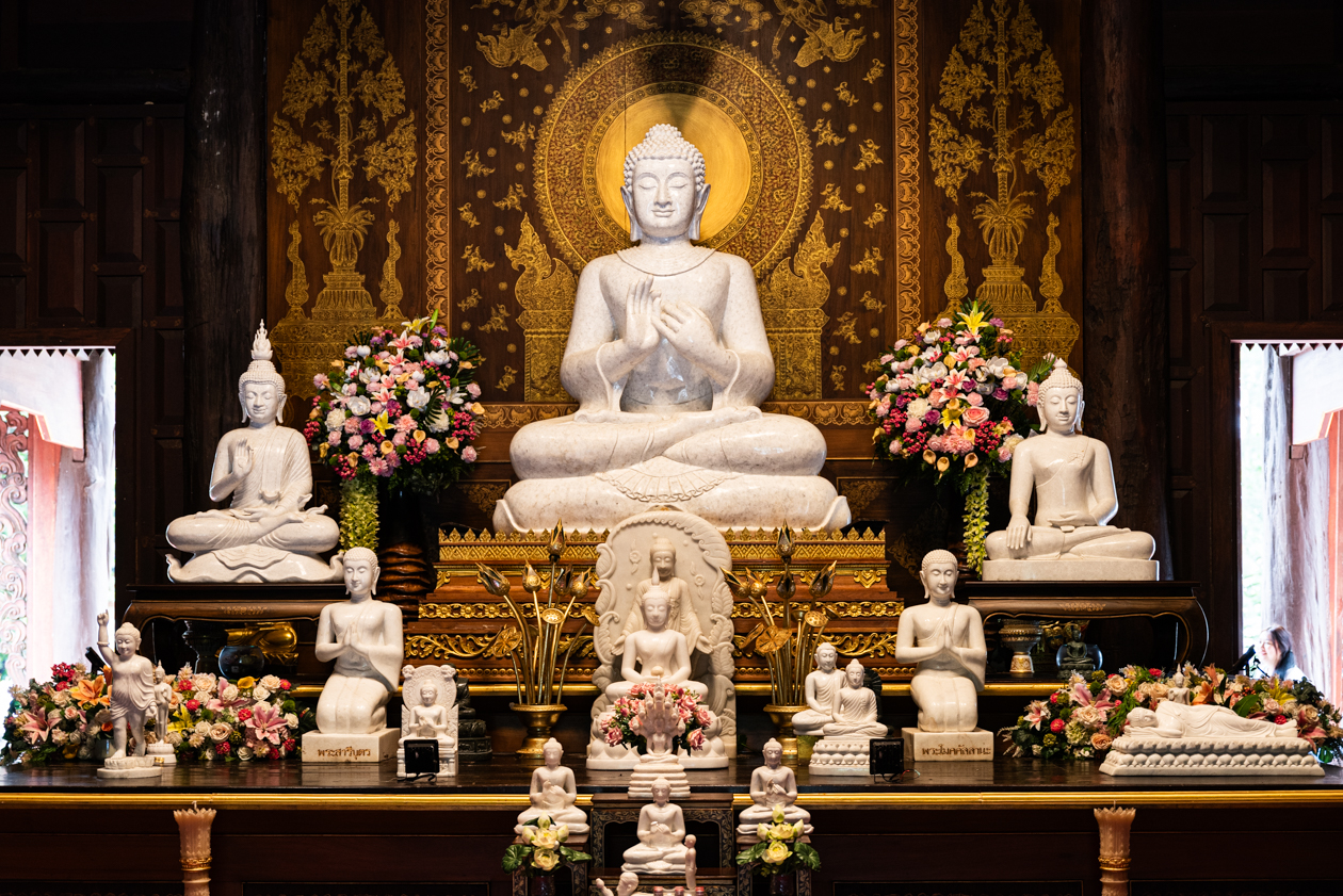 • L’intérieur est décoré de peintures murales traditionnelles représentant la vie du Bouddha, les enseignements du Dhamma et diverses scènes de la cosmologie bouddhiste.